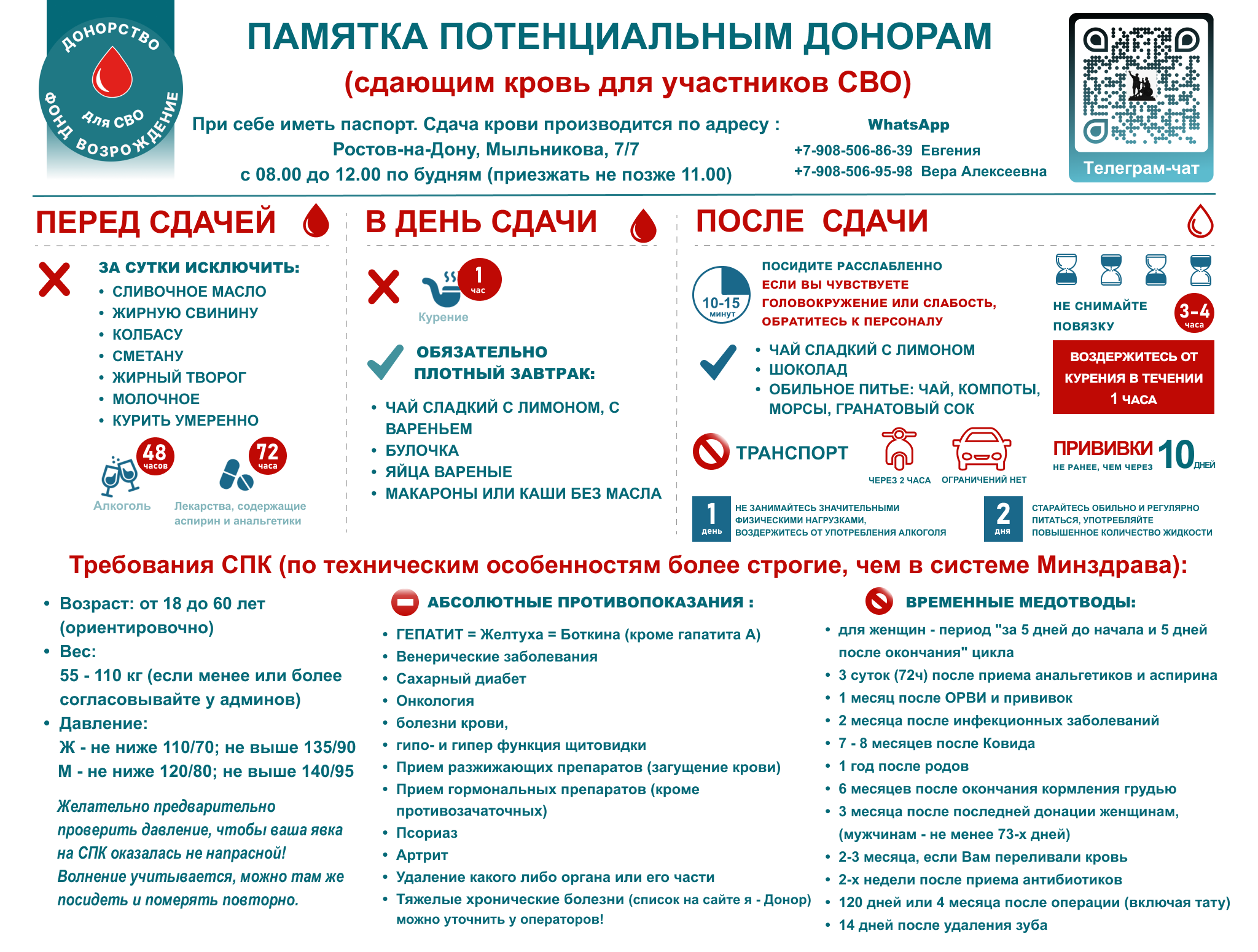 Памятка потенциальным донорам (сдающим кровь для участников СВО) Сдача крови для Ростовского госпиталя производится только по адресу: Ростов-на-Дону, Мыльникова 7/7 с 08.00 до 12.00 приезжать не позже 11.00 с собой иметь паспорт